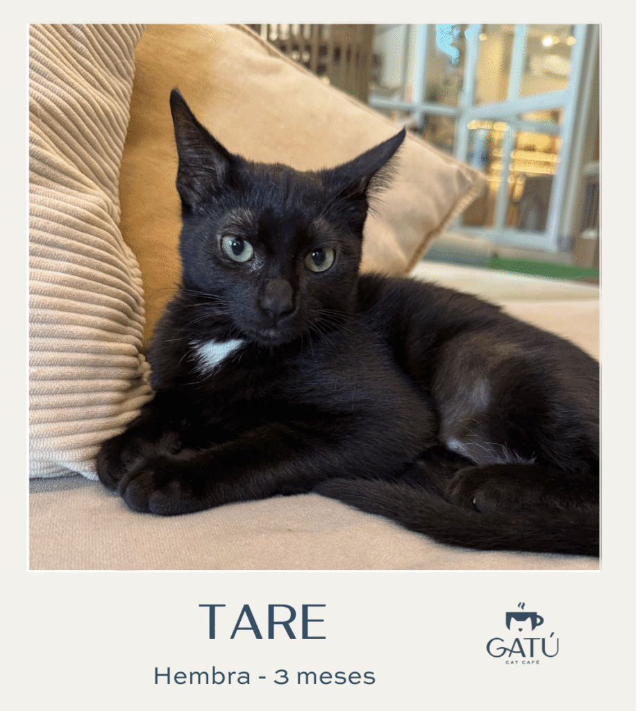 Tare es una gatita muy risueña y alegre. M/H: Hembra Edad: 4 meses Esterilizado/a: Sí Vacunas (triple felina + rabia): Sí Descarte sida/leucemia: Sí Desparasitado/a: Sí NOTA: Descarte negativo IDEXX