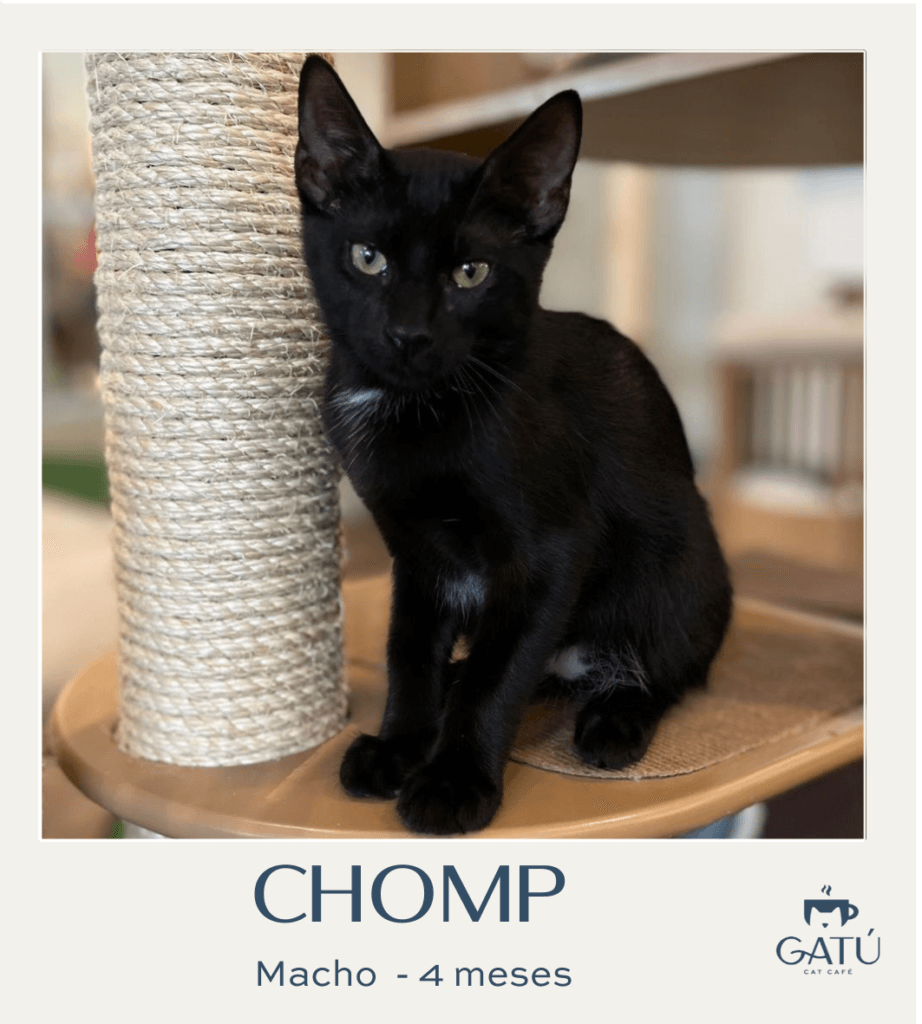 Chomp es un gatito muy sociable y risueño. M/H: MachoEdad: 7 mesesEsterilizado/a: SíVacunas (triple felina + rabia): SíDescarte sida/leucemia: SíDesparasitado/a: SíNOTA: Descarte negativo IDEXX
